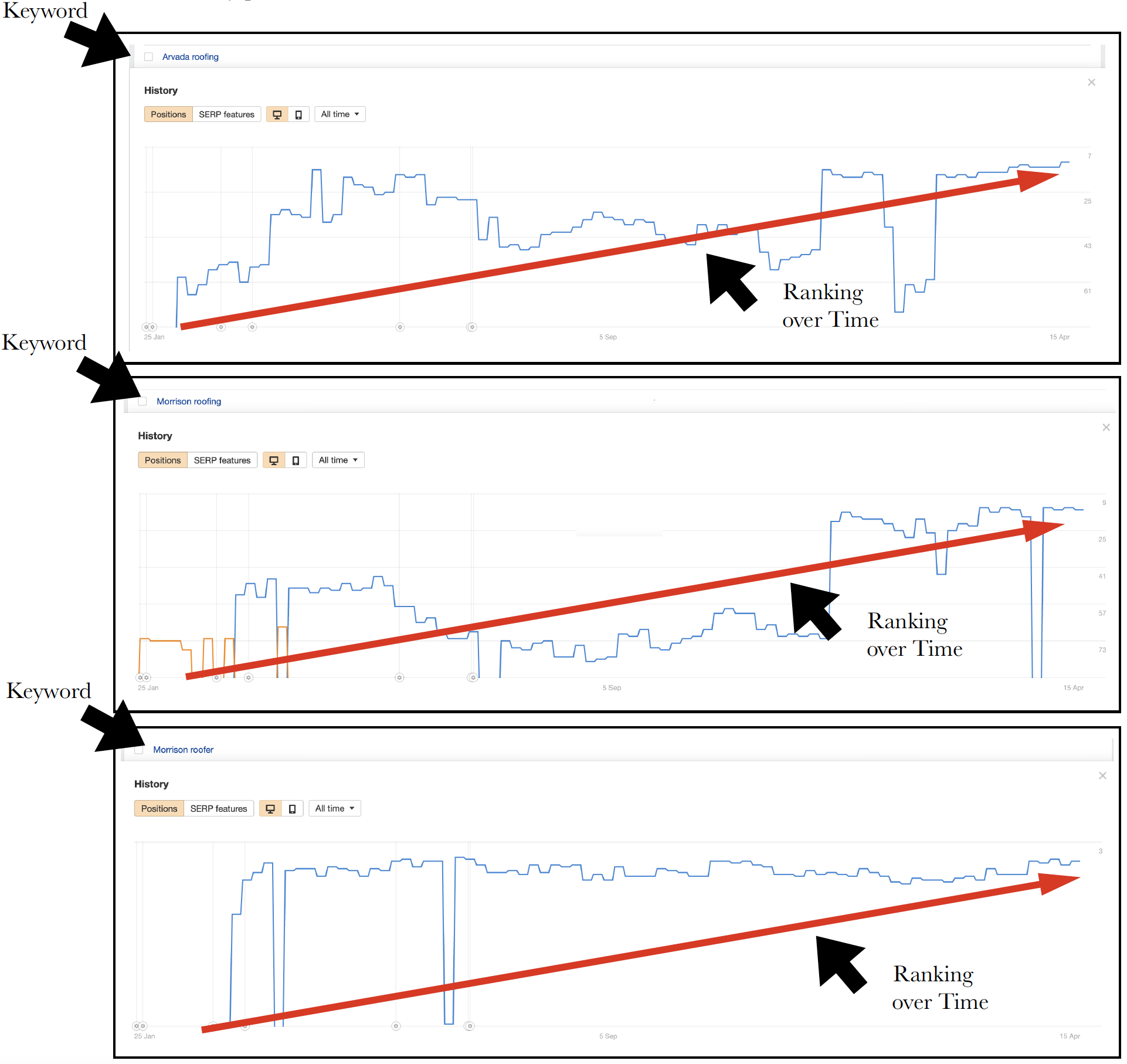 This is a small selection of the amazing results we got for this client. It is a great example of how we are able to cover every city and town in a roofing company's service area to get them leads coming in from every part of the metro. It also show how SEO is a test of patience. Like fine wine, SEO takes time. Check out these increase in rankings of BIG keywords.